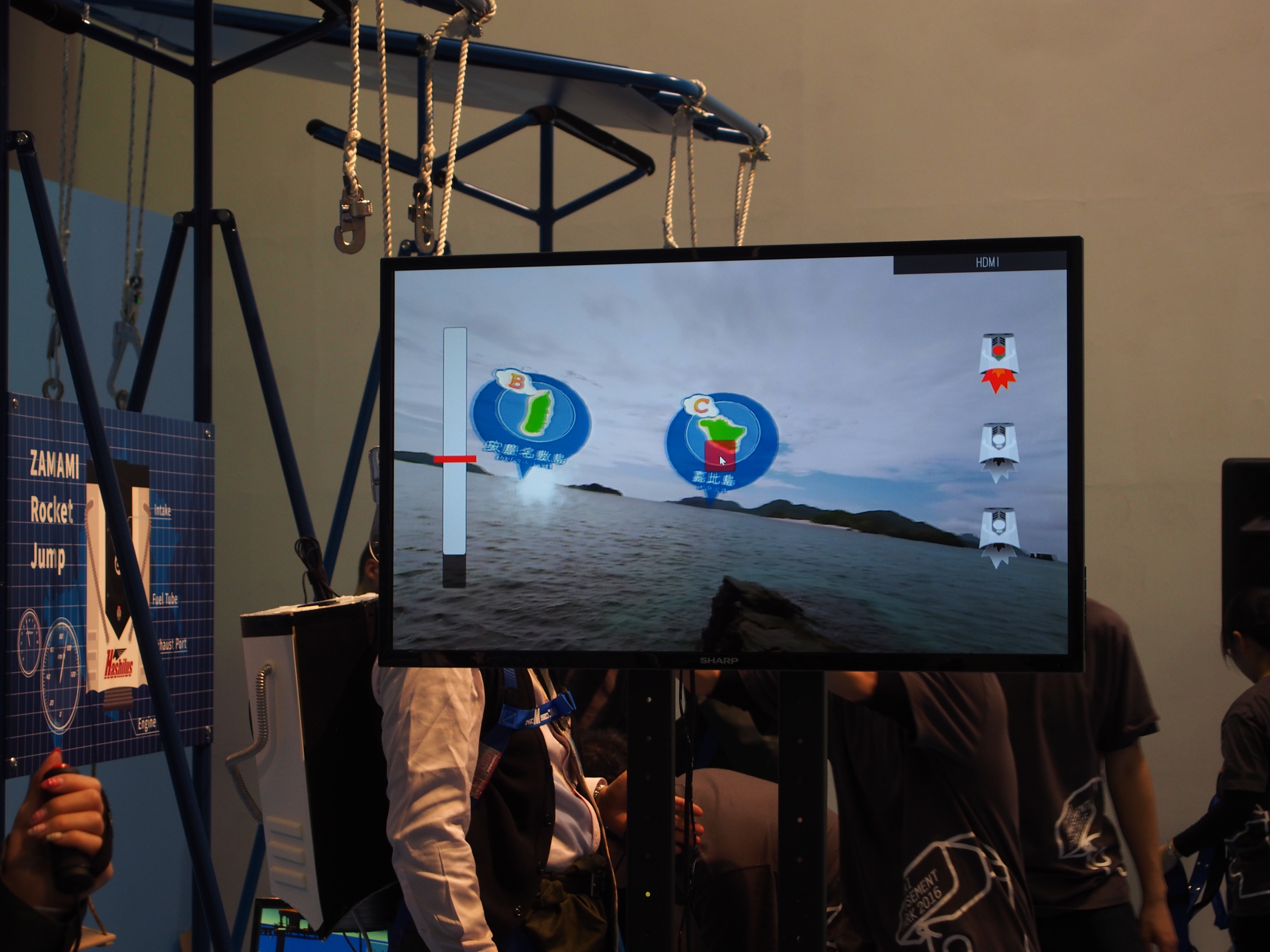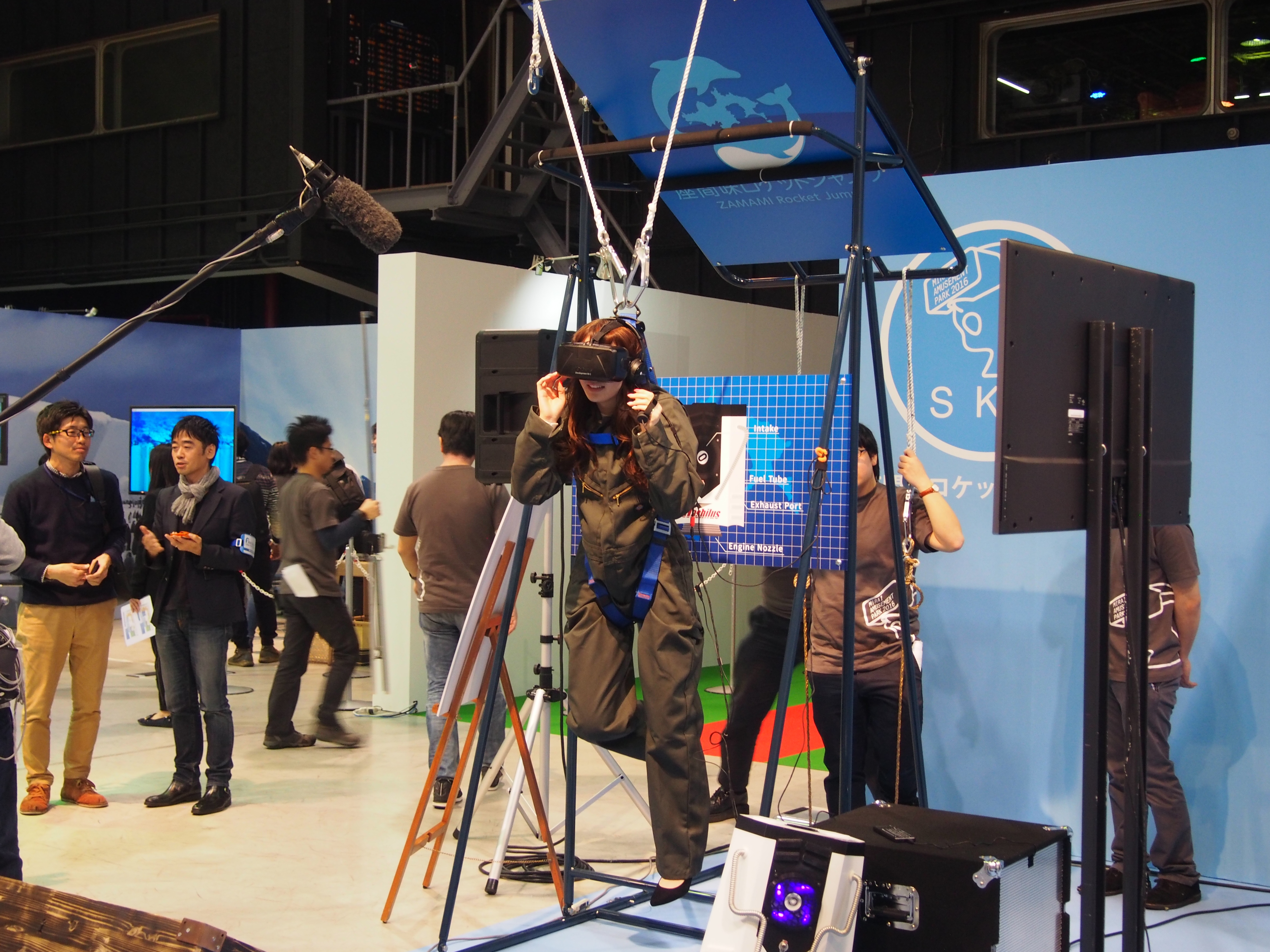 仮想のジェットパックを背負い、体験者のジャンプに合わせてファンが回ってロケット噴出を演出する工夫が施されています。かなり大掛かりな仕掛けですが、VRならではの魅力を伝えることができるコンテンツです。