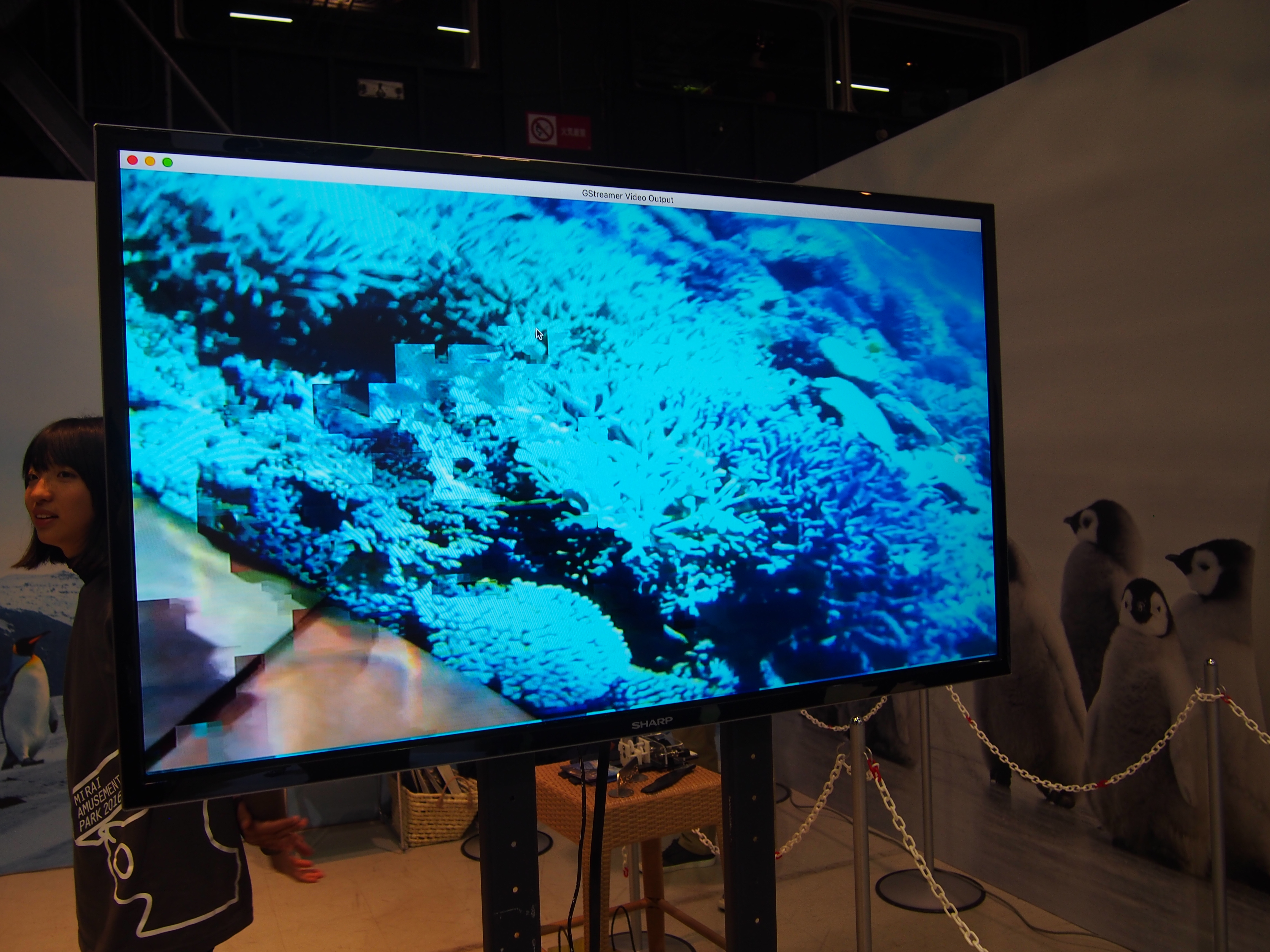 遠隔地のプールにいるペンギンロボットをリモートコントロール体験する、テレイグジスタンスのコンテンツ。