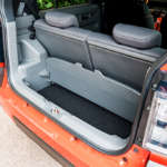 タフトはその状態を重視して後席のスライド機構を省いた、と考えればすべてが腑に落ちる。何しろ、背もたれを倒した状態の荷室は、ダイハツの軽自動車の中でフロアが最もフラット。その上、荷室を少しでも広くするために、リアドアのアームレストさえ装備していないなど、荷室の使い勝手に徹底的にこだわった跡が見て取れる。つまりタフトは、リアシートの居住性よりも、背もたれを倒して荷室を拡大した状態を重視したといえるだろう。