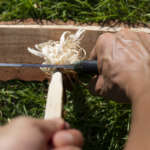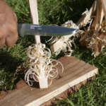 子供の頃は鉛筆をよくナイフで削っていた(時代だな〜)ので、同じだろうと思っていましたが、意外と違いました。鉛筆を削る時は、左手でブレードを支えて押すように削っていきますが、フェザースティックはナイフを木に押し当てて、押し出すように削っていきます。