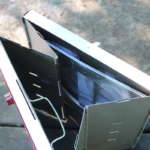 トップはこんな感じで細長い穴が空いています。このおかげでオーブン料理だけでなくほどよく煙を排出するスモーク料理もできるんです。スモークをするときは、オーブンの底にアルミホイルを敷き、そこにチップを置いてガソリンツーバーナーに載せるだけ。簡単です。スモークウッドならバーナー不要。