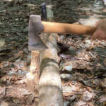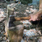 また、斧の背中部分まで薪に食い込んでしまった場合。これが一番焦るのですが、その場合は、何度かそのまま薪割り台に叩きつけてください。これでほとんど割れるはずです。