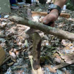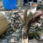 バトニングのいいところは、斧よりも正確に割りたい部分を割れるので、端の方をだけを割りたい場合にも狙って割れるので有効です。太い薪などは、いきなり中央から割らずに、端から割っていくと、ナイフでもほとんどの薪が割れますよ。