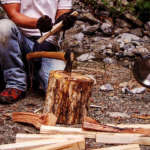 おさらいすると、刃物の軌道上に自分の身を置かない。刃物と自分の間に薪割り台や木を置く。そして、刃を小石などから守るために、地面との間に薪割り台を置く。