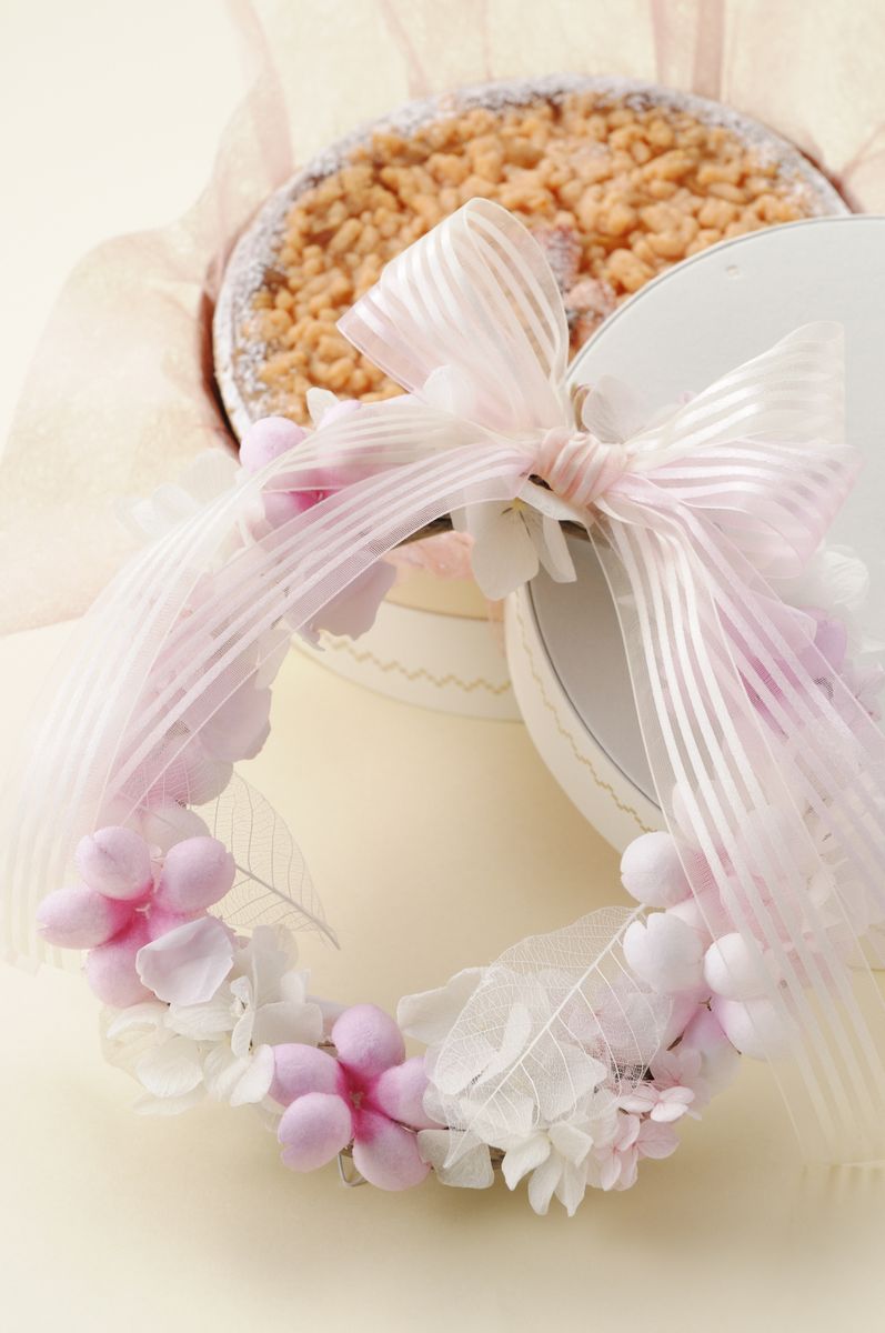 「桜のタルト」は桜の花の塩漬けとうぐいす豆を加えて焼き上げたタルトの上に、フレーク状にした桜色のクッキー生地をトッピング。セットになった華やかなプリザーブドフラワー製のリースは第一園芸制作のもので、半永久的にこの美しさを愉しむことができるので、記念すべき新入学や新生活への贈り物にぴったり。