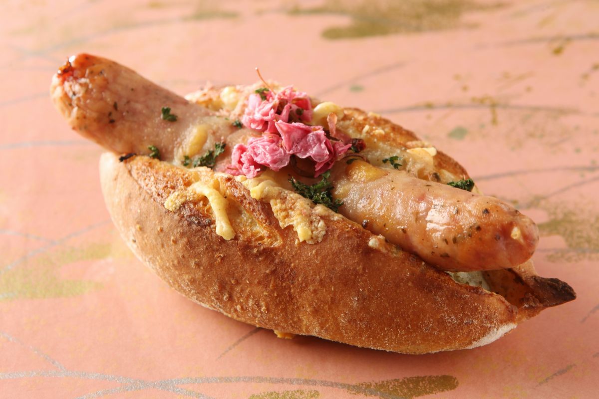 桜の葉が入った生地を使っていて、桜の香りをたっぷり感じることができます。トッピングには塩漬けにした桜の花と葉を使い、パンからはみ出す長さのジューシーなソーセージとの組合せは幅広い世代に喜ばれるフードです。