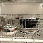 ワイヤーという素材の性質上、バスケットのなかにホコリが溜まりにくいのも特徴です。そのため、キッチン用品を収納して棚の高い位置に置いても大丈夫。上からのホコリを防ぎたい場合は、布を被せましょう。大きなサイズの「18-1ステンレスワイヤーバスケット 4」(2590円)は、食器類や調理器具をまとめて収納するのにぴったり。ステンレスで錆にも強いので、皿などが多少濡れたままでも安心です。アクリルスタンド等の仕切りと組み合わせると、食器を出し入れするときにガチャガチャしません。