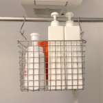 S字フックを使って吊るせるのも、「ステンレスワイヤーバスケット」の魅力。筆者の自宅では、お風呂場のタオルかけに「18-1ステンレスワイヤーバスケット 1」を吊るし、その中にシャンプーボトルや洗顔アイテムなどを収納しています。床に直置きするとボトル類の底にはぬめりが出がちですが、これならしっかり水が切れるので大丈夫。ただし、フックの支点がずれるとバスケットが大きく傾いてしまうので注意が必要です。