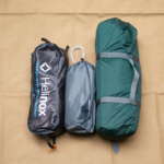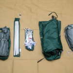 中から出してみました。左からインナーテント、ポール、張り綱+ペグ、フライ、別売フットプリント。それぞれに収納袋があるのでバラバラにして隙間に詰め込むことだってできます。