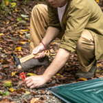 フライシートの角が90度になるよう意識しつつ、端がピンと張るようにペグで固定します。ちなみに写真では地面が硬く、付属のペグでは心許ないので手持ちの鋳鉄ペグを使っています。