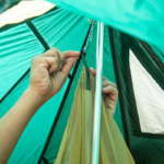 ファスナーを開き、付属のポールを内側に立てます。ポールの片側には黒いキャップが付いているので、こちらを下にします。