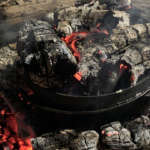 この時は、下は小さい熾火(おきび)だけにして、大きな炭は上にのるだけ載せる、横にも少し置きました。フタの上には載るだけ載せていいと思います。