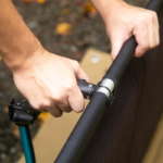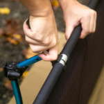 シートを立てて下側のソケットをフレームに押し当てたら、上側でレバーを握りながらフレームに押し込みます。フレームの線とソケットの中心がそろうようにするのがポイントです。