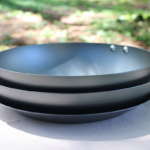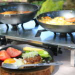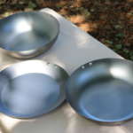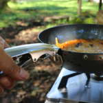 ソロやデュオなら20cm前後のもの、ファミリーなら24〜26cmが目安です。鉄のフライパン=重いと思いがちですが、「COCOpan」の厚みは1.6mm(写真にはありませんが「プレミア」という3.2mmのフライパンもあります)で、驚くほどの重さではありません。