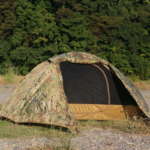 フルクローズにするとこんな感じです。ポールがあればパネルを跳ね上げてもいいですね。マルチカム柄なので後ろの木々や地面となじんでしまいます。広大なキャンプ場でサイトから離れるときは迷子にならないかドキドキ。