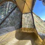 前室は長靴を置いても十分な高さ・広さがあります。とはいえイスを入れられるほどではありません。ちなみにフロアの下にもうひとつバックルが伸びていますが、これはミリタリーコットへのアタッチメント。試しに手持ちのコットに装着したところ、コットの幅が狭く、かっこ悪くなってしまいました。