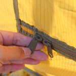 伸ばしたフレームをテント四隅のグロメットに取り付け、フックで引っかけていきます。フレームは端っこがちょっとふくらんでいて、抜けづらいのがいいですね。