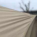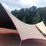 さらに、やりたかったのは手持ちのタープを接続させて巨大リビングを作ること。手持ちの「焚火タープコットンヘキサ(テンマクデザイン)」を合体させてみました。やり方は超簡単。モーニンググローリー開口部のサブポールに、タープの片側をジョイントするだけ。