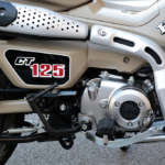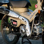 上げられたのは、もちろんシート位置だけでなく、地上からのクリアランスも40mmアップの165mmに。未舗装路を行く時に頼もしいスペックです。ちなみに、スタイル上では排気系のアップマフラーが目につきますが、吸気系にも配慮され、荷台付近に空気の取り入れ口を設けた“ハイマウント吸気ダクト”が採用されました。実際に使うかどうかは別にして、CT125ハンターカブは一定の渡河能力を備えているのです。
