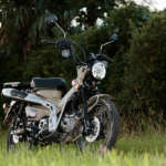 カブシリーズをベースにオフロードテイストを強めた原ニモデルといえば、すでにスーパーカブ110を基にした「クロスカブ110」があって、価格は34万1000円。今回紹介する新しいCT125ハンターカブは44万円です。排気量が110ccから125ccにアップしているとはいえ、「約10万円の価格差はどうなのよ?」と思う人がいるかもしれません。ワタシは思いました。が、CT125ハンターカブの実車を前にすると、「なるほど~」と納得させるものがあるんですね。独特の存在感があって、たたずまいがいい。