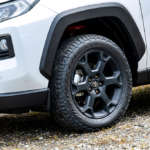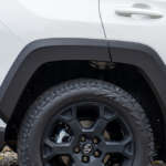 そんなRAV4に追加された特別仕様車「アドベンチャー“オフロードパッケージ”」の狙いは、さらに無骨かつアグレッシブにし、悪路走破性を高めること。エクステリアでは、前後バンパー下にグレーメタリックの塗装が施されたスキッドプレートを追加するほか、ルーフには大型のルーフレールを装着。そして足下は、見た目もワイルドな18インチのオールテレインタイヤ(悪路も走れるタイヤ)を、マットブラック塗装のホイールに組み合わせて履かせている。