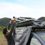 ルーフトップテントを広げるには、ラダーを使ってテコの原理を利用します。複雑なフレームを組み立てることも、何本もの張り綱をペグで固定することもなく、とっても簡単でした。