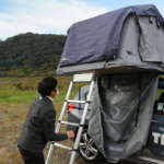 クルマが傾いているとテントの床も斜めになるので、なるべく平らな地面を選びます。また、ラダーが風上になると急な強風であおられる危険があるので、風向きを考慮して駐車位置を決めます。