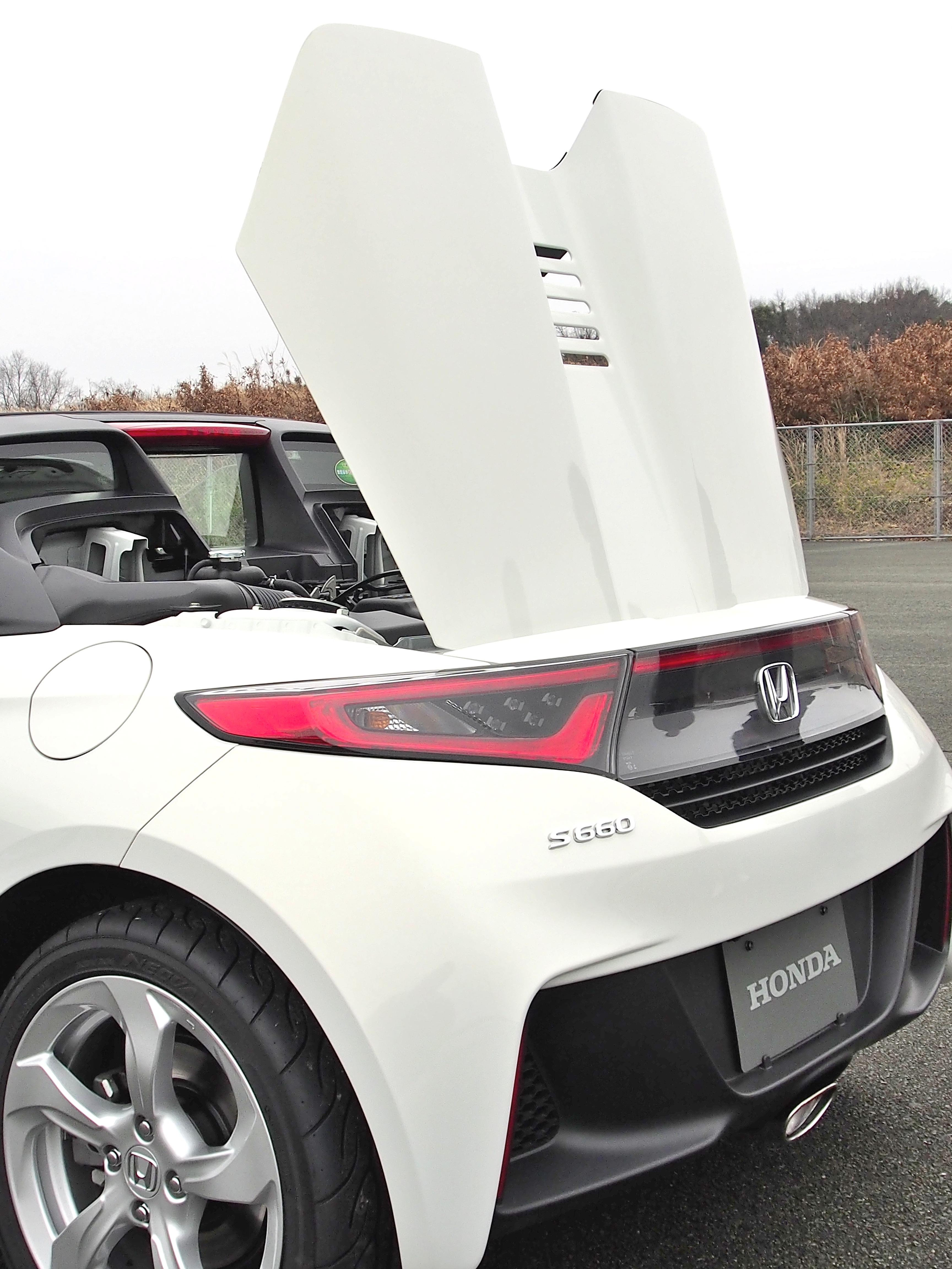 ミッドシップエンジン、後輪駆動のS660ですから、エンジンルームはドライバーズシート後方に配置されています。エンジンルームのボンネットはリアを支点に開く構造です。同じMR方式の軽自動車ということで比較されることも多いホンダ「ビート」はボンネットの支点がキャビン側にありエンジンがほとんど見えない構造でした。エンジンがしっかり見えるS660はメンテナンスがやりやすそうですね。