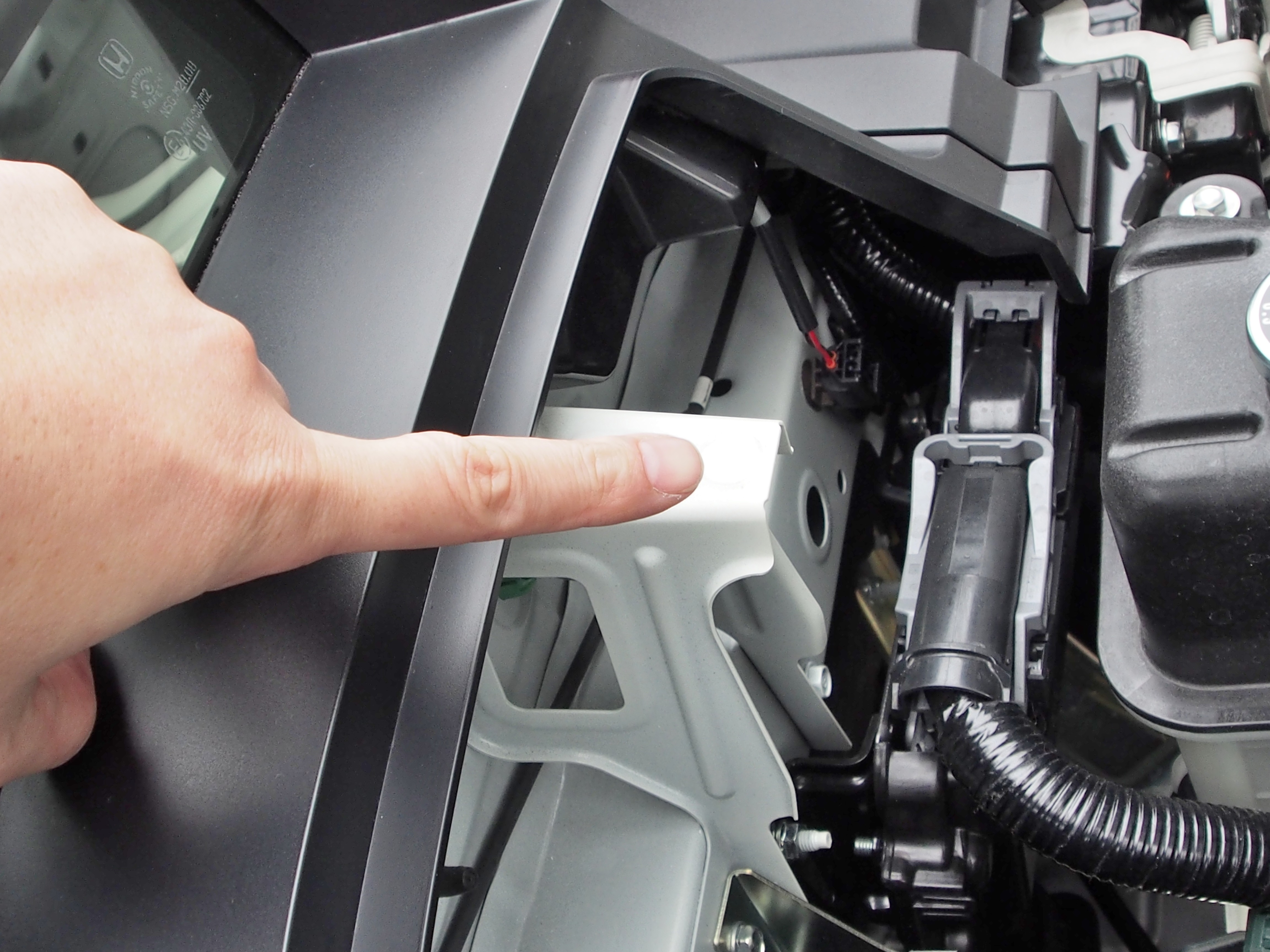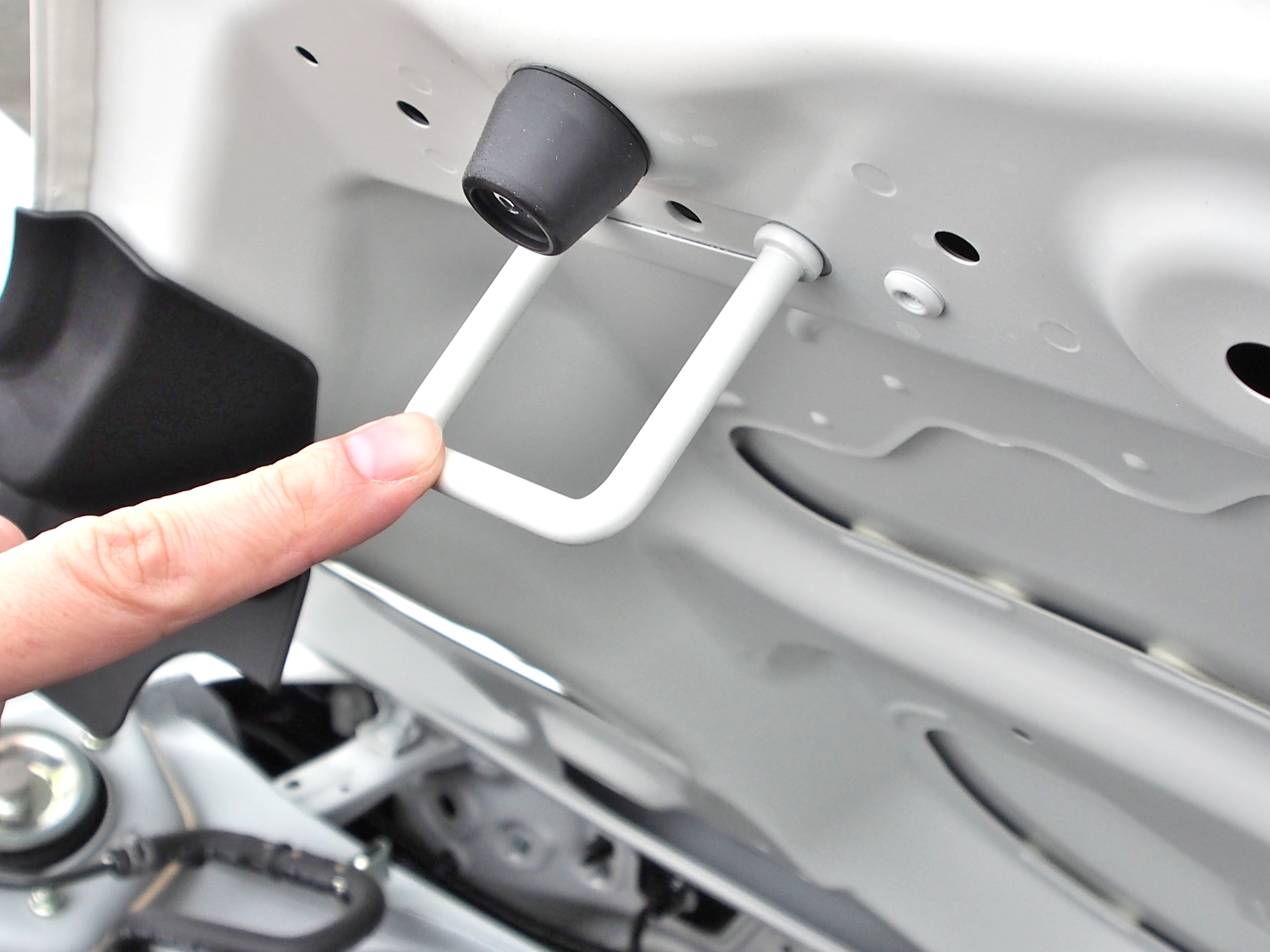 万が一後方から追突されたときにボンネットがキャビン内に押し込まれないよう、エンジンルーム内に2か所のガードが設置されています。