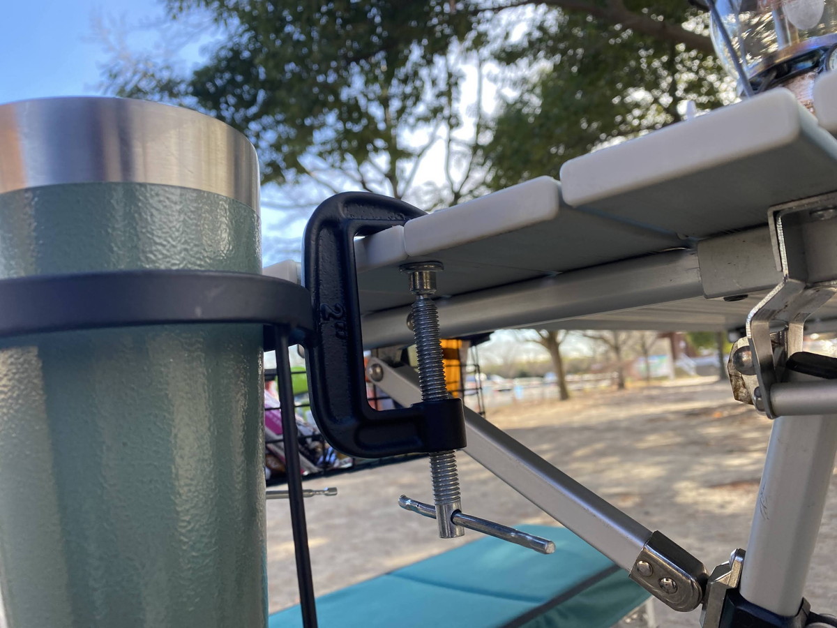 キャンプでのボトルや小物の置き場所に!クランプで取り付けるホルダーが有能です の写真・画像 3/10