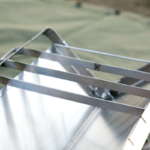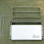 本体を開いてサポートバーをセット。サポートバーを取り付けることで、ネジどめしているところへの負担を和らげます。耐荷重は4kg。ソロ用のクッカーや小さな鉄板であれば問題なく載せられるスペックです。