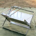 本体はV型に開き、脇から空気を供給する仕組み。空気穴も灰受けもなく、空気がうまく抜けるように側面を風上に向けましょう。風が強くなったら90度回転してプレート面を風上に。本体のプレート面は薪を支えるとともに風防の役割も担っているんですね。