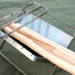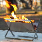 小型焚き火台で困るのが、市販の40cmほどある長い薪がはみ出てしまうこと。少しくらいなら、はみ出ても燃えかけの薪が地面に落ちないように見ておけばいいのですが、バランスが悪くて倒れそうになるものもあるわけです。「男前ファイアグリル」はどうでしょうか?