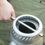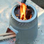 上から多めの小枝を突っ込んでサイドから種火を入れ、すぐにこの薪投入口を閉じて着火。煙突効果+ほんの少し上が狭くなっているためか本体の温度が上がるのが早いのでしょう、すぐに勢いよく燃えはじめて二次燃焼がはじまるのもスピーディー。