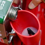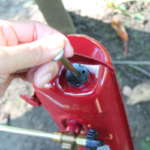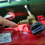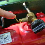 燃料タンクを取り出し、燃料バルブをOFF方向に回して完全に閉じていることを確認。ホワイトガソリンを8分目まで入れます。燃料缶から注ぐ場合は、注ぎ口を上にするとドバッとこぼさずにすみますよ。