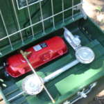 フタを開くとゴトク、その下に燃料タンクが収まっています。燃料タンクの周囲には余裕があるので取り出しやすいのですが、その分、燃料タンクが動くのでメンテナンス用の雑巾や軍手を詰めておきましょう。