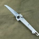 日本有数の刃物の街、燕三条の名が付いたフォールディングノコギリです。ハンドルはステンレス、刃はSK-5。全体がシルバーで統一されており、プライヤー付きのマルチツール、レンチなんかと並べたくなる工具っぽいデザインに仕上がっています。もちろんハンドルの握りやすさにこだわっていて、角ばって見えますが肌にやさしく、引いたときに力をいれやすい形になっているんです。