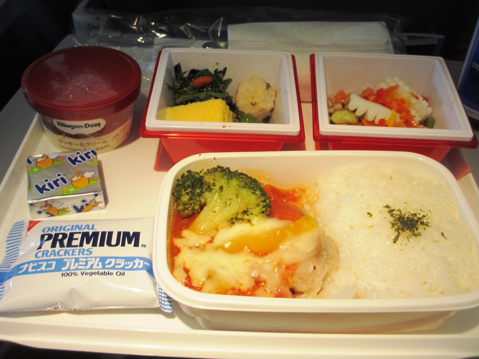 ゴマ和え、卵焼き、煮豆があったりという和食の小鉢スタイルで、味もちゃんとしていたのは、さすが日本の航空会社JAL。メインはお米のごはんですが、とろけるチーズがトッピングされたケチャップ風味の豚肉のおかずでしたので、海外の人にも食べやすいメニューだと思います。ヘタなデザートよりも、ハーゲンダッツのアイスは気が利いていて嬉しい!