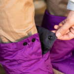 スネあたりにスナップボタンがついているため着脱もサイズ調整もラクラク。タイトなパンツだけでなく、フリースのようなボリュームのあるパンツでも合わせられます。また、切り込みの入った部分で折り返せばショート丈としても使用可能。昼のちょっと暖かい時はショート、夜の寒い時はロングと体温調整しやすいのもこのテントシューズならではの魅力です。