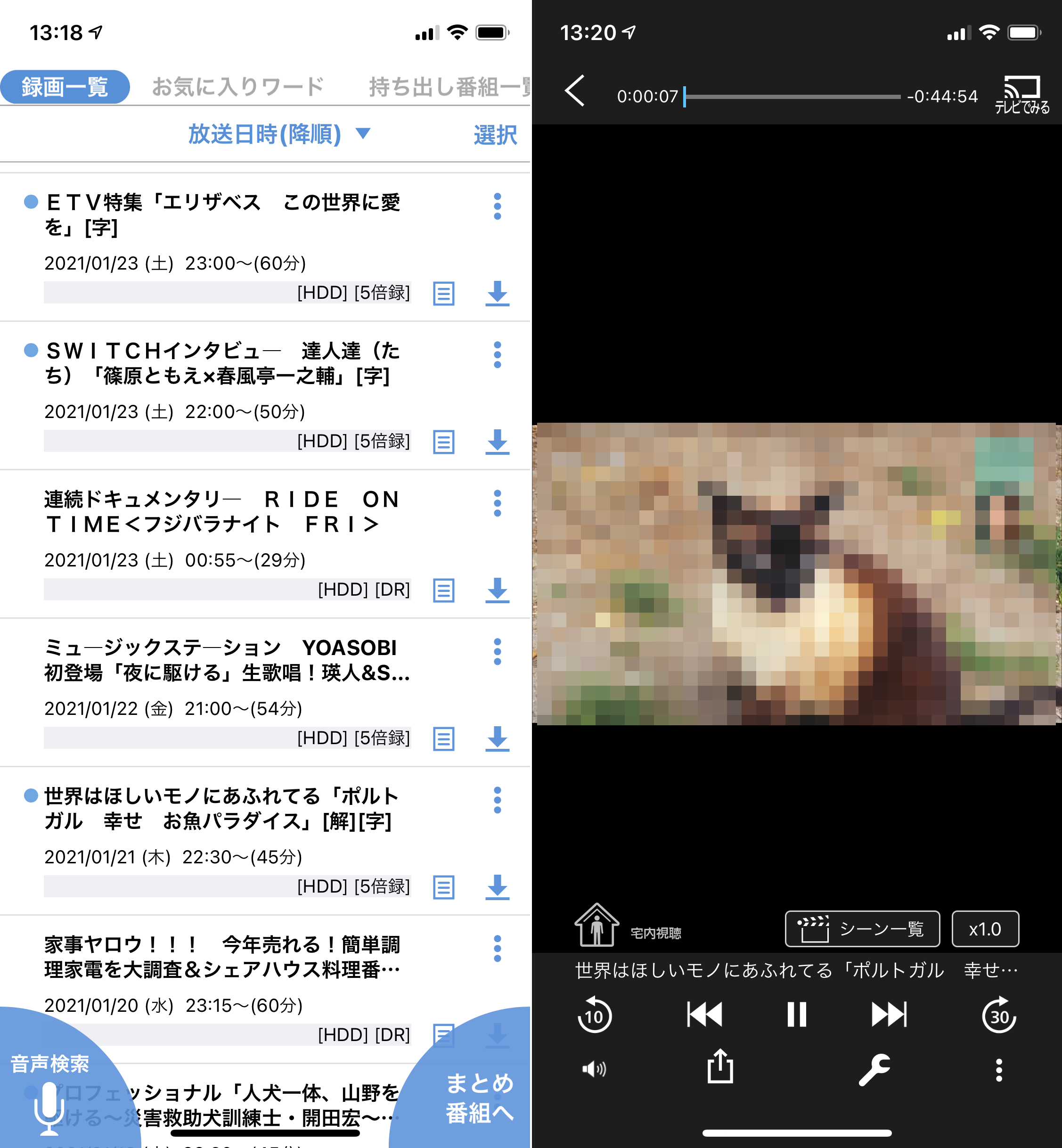 ▲「録画番組」タブに録画した番組の一覧が表示される(写真左)。番組名をタップすると、再生が開始する(写真右)