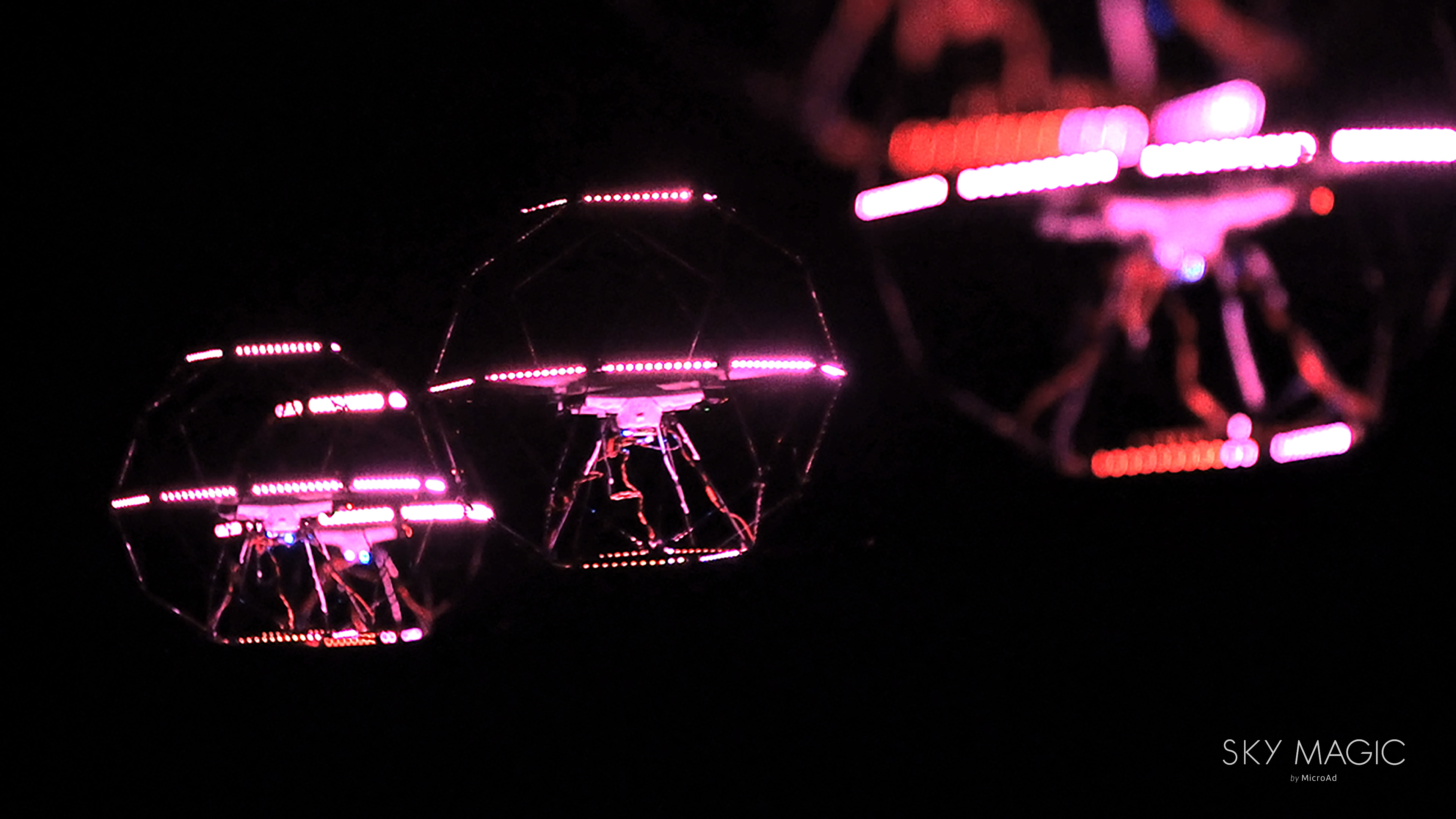 ドローンは墜落しても壊れないようにカーボンファイバーで覆われている設計。LEDはカーボンファイバー上に取り付けられている。イベント会場・フェスティバル会場・花火大会・ファッションショー・コンサート・球場やラグビー場などの大型スタジアムや、テーマパークなどにおける既存の演出に合わせて「Sky Magic」を利用することで、発光した複数のドローンによるロゴやオリジナルの文字や形、動くなどといった展開をプロモーションとして利用できるようになると高城氏はさらに話した。
