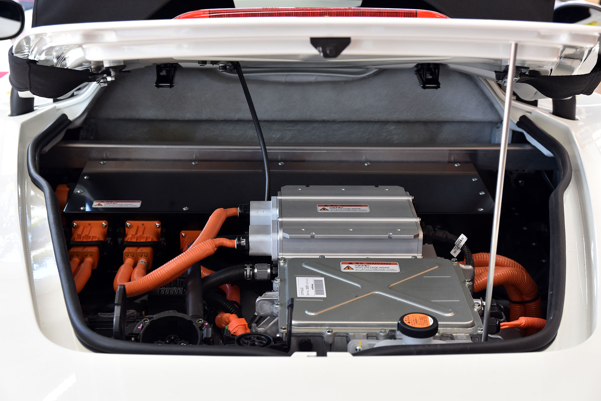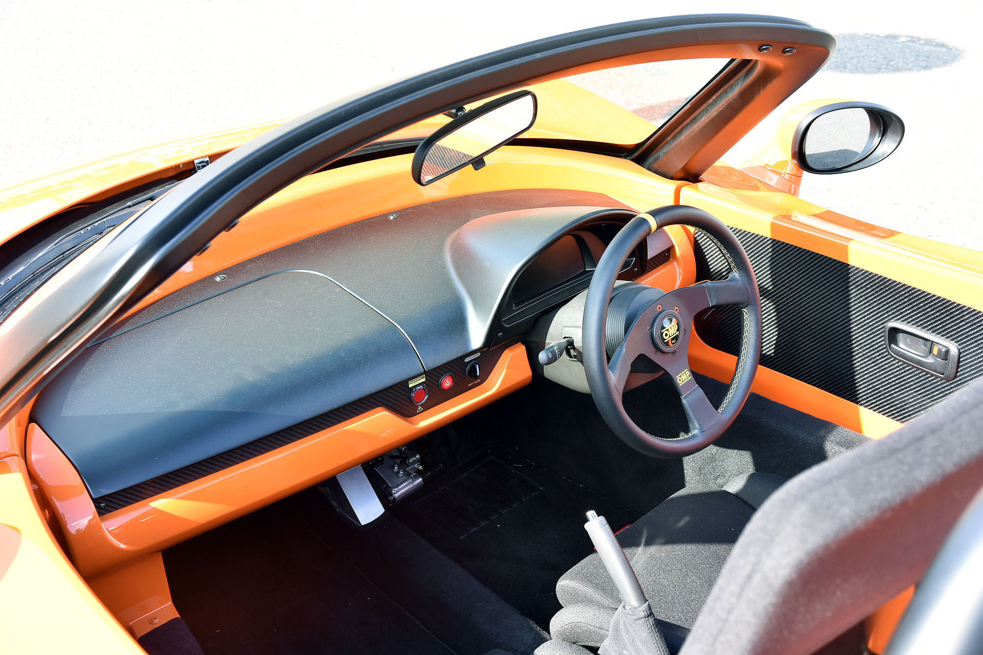 初めて実車を目にして思ったのが、思ったよりも大きい、ということ。全長3865mm、全幅1735mmの2シーターで、サイズ的にはマツダ・ロードスターとほぼ同じ。リア側にモーター類がギッチリ詰まっているので、レイアウトとしてはミッドシップですが、同じくミッドシップのホンダ・S660よりもだいぶ大きい。