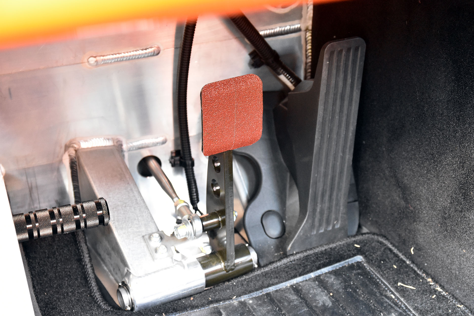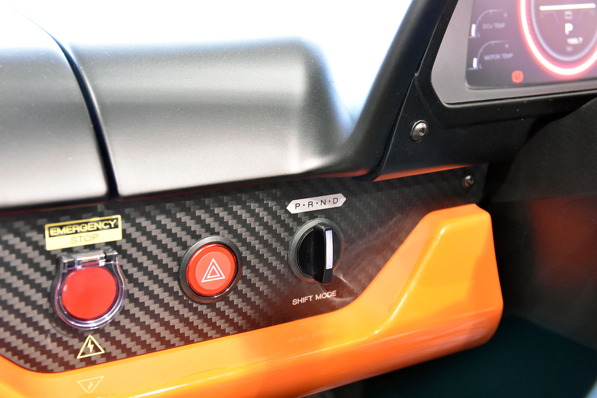 ハンドル左にあるスイッチは3つのみ。右からシフトに該当するスイッチ、ハザードボタン、緊急停止ボタン