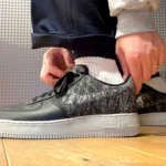 サイドパネルには100%リサイクルフェルトを使用。ブラックやグレー、ホワイトの繊維がランダムに混じり合って、ナチュラルな雰囲気を醸し出しています。グラデーションがかったスウッシュロゴも特徴的です。