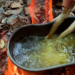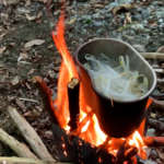 1人分のスープや煮込み料理にも、ちょうどいいサイズ。チタンのキャンティーンカップで煮込み料理をする場合は頻繁に掻き回すことや、カップ自体を回したり、焚き火で火が当たる位置を調整することで、熱伝導の悪さを補いましょう。