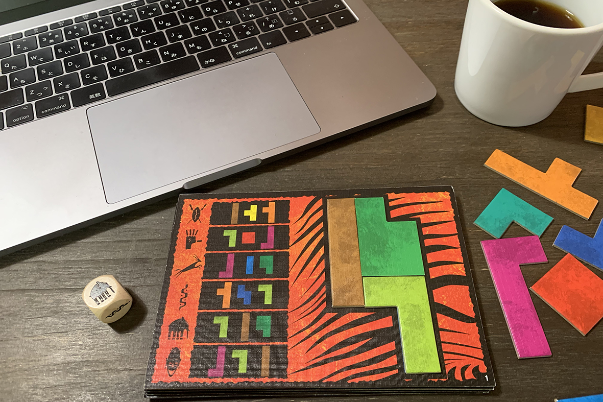 まず1人でできること、ルールが簡単なこと、短時間でできること、を基準にザクっと探して行き着いたのがこの「ウボンゴ(Ubongo)」。決め手は、「あっ!テト○スに似てる。だからルールは多分簡単なはず」という単純な理由です。購入したのは「ウボンゴ スタンダード」というもので、購入後に調べたら「ウボンゴ ソロ」という1人用があったようですが時すでに遅し。