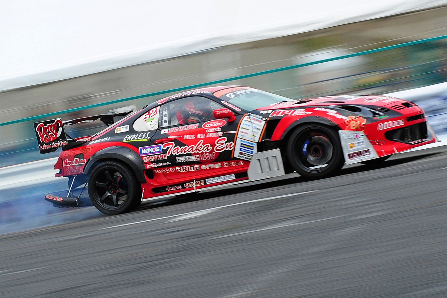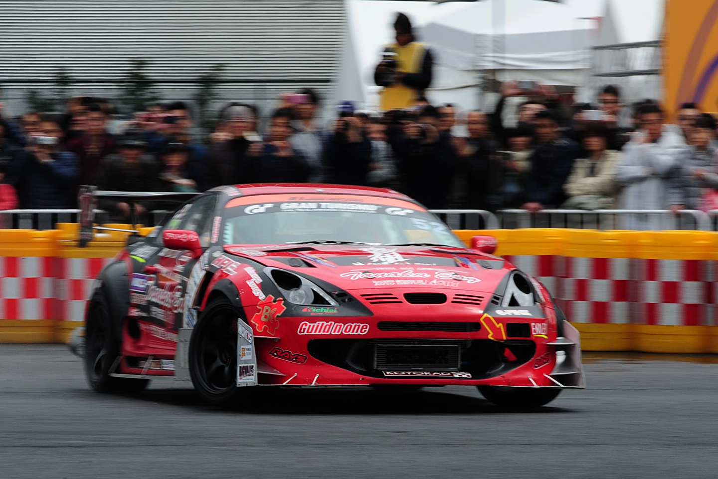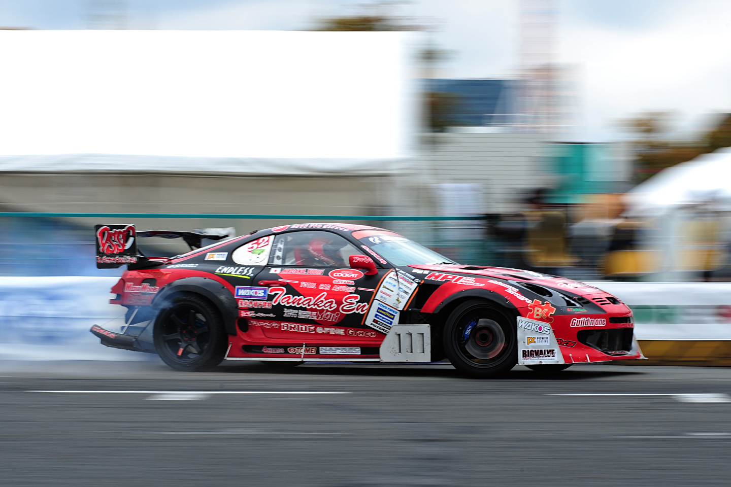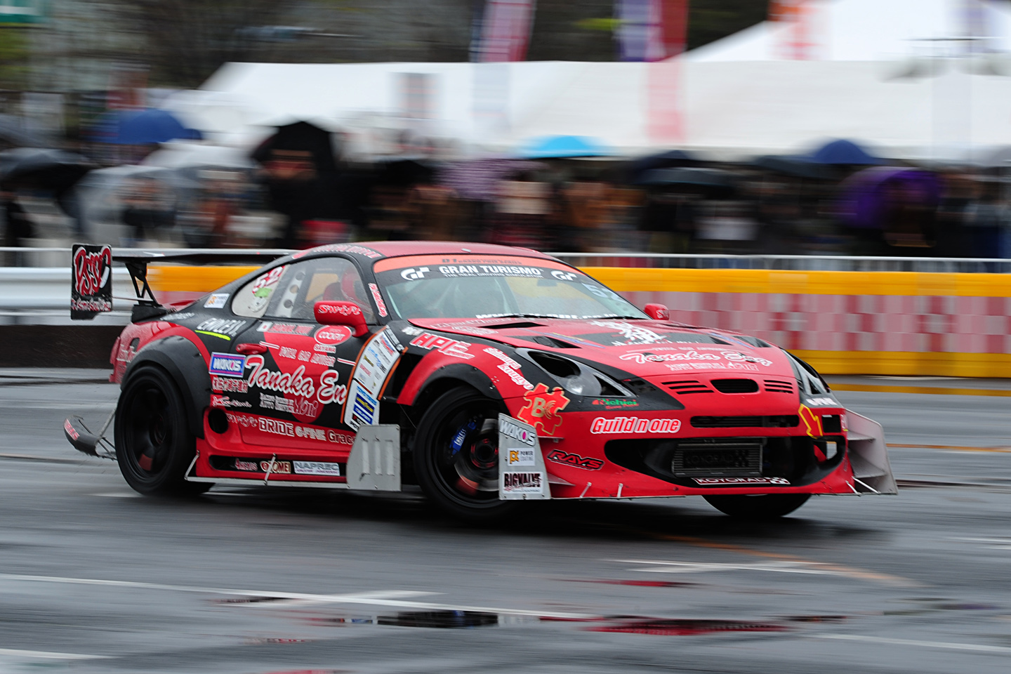 ド派手なドリフトとタイヤスモークで来場者を沸かせた、田中裕司選手の「魂同組 with NICHIEI HADAKA SUPRA」。最高出力は驚異の800馬力を発生!