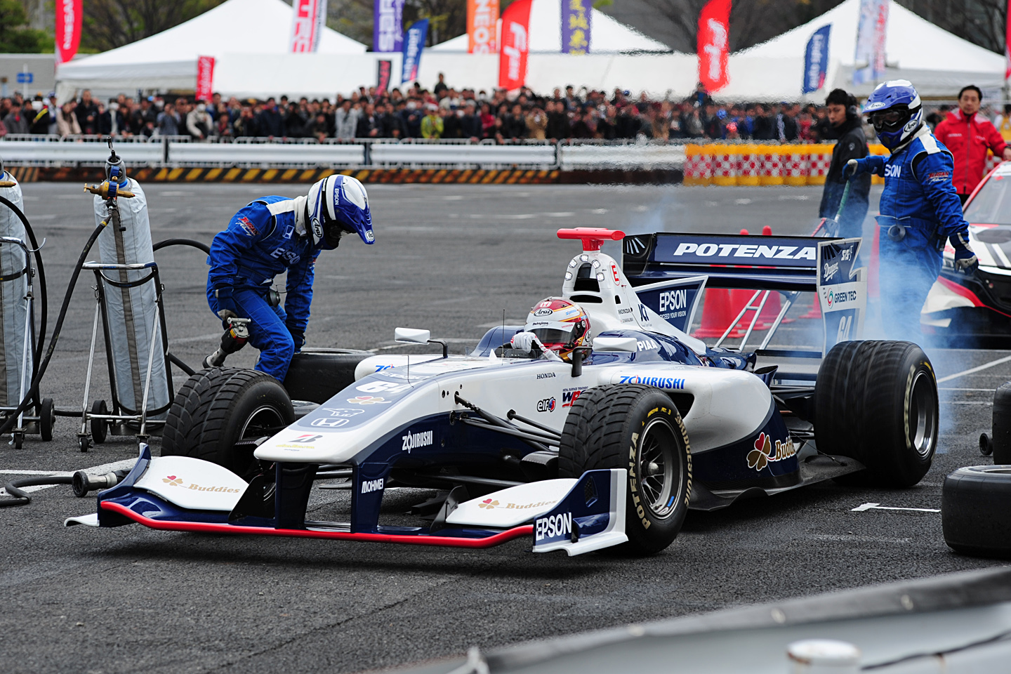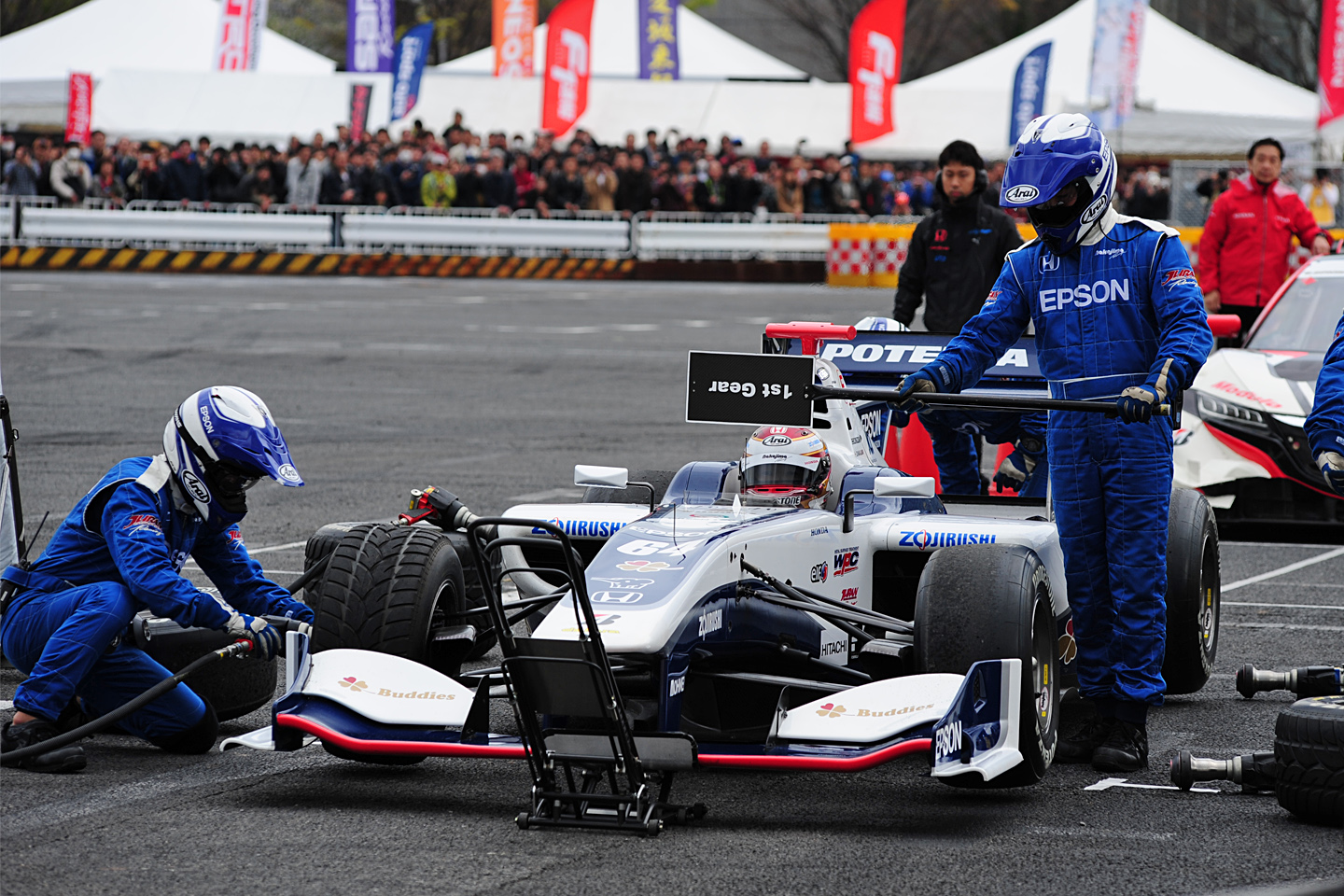 スーパーフォーミュラは「NAKAJIMA RACING SF14」がデモランのほか、タイヤ交換のデモンストレーションを実施。スピーディな作業に会場からも大きな拍手が。