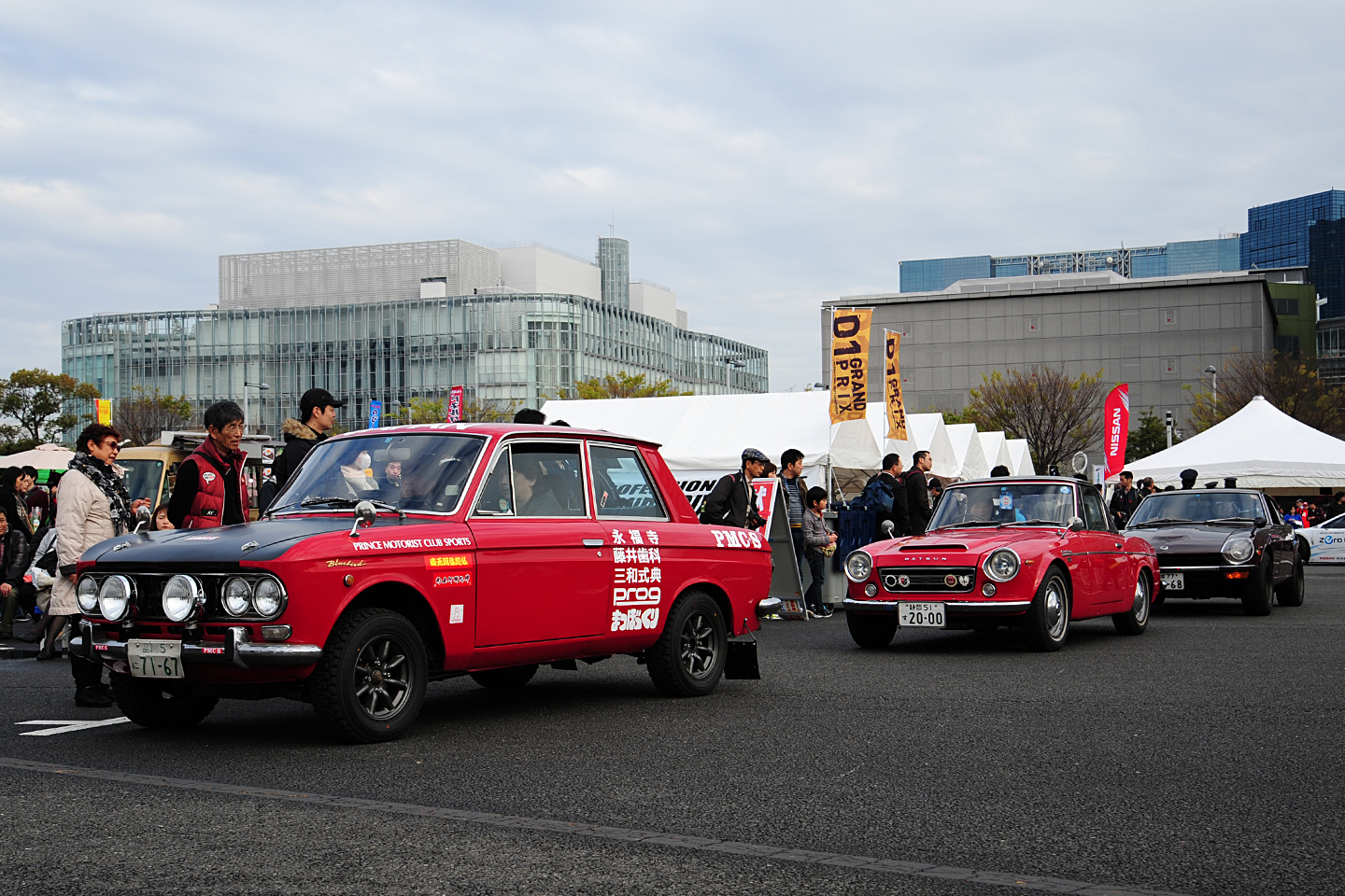ヒストリックカーやレプリカカーも多数展示。先頭は海外のラリーでも活躍した2代目「410型ブルーバード」。後方には、200km/hを超える最高速度を誇った初代「SR311型フェアレディ2000」の姿も。