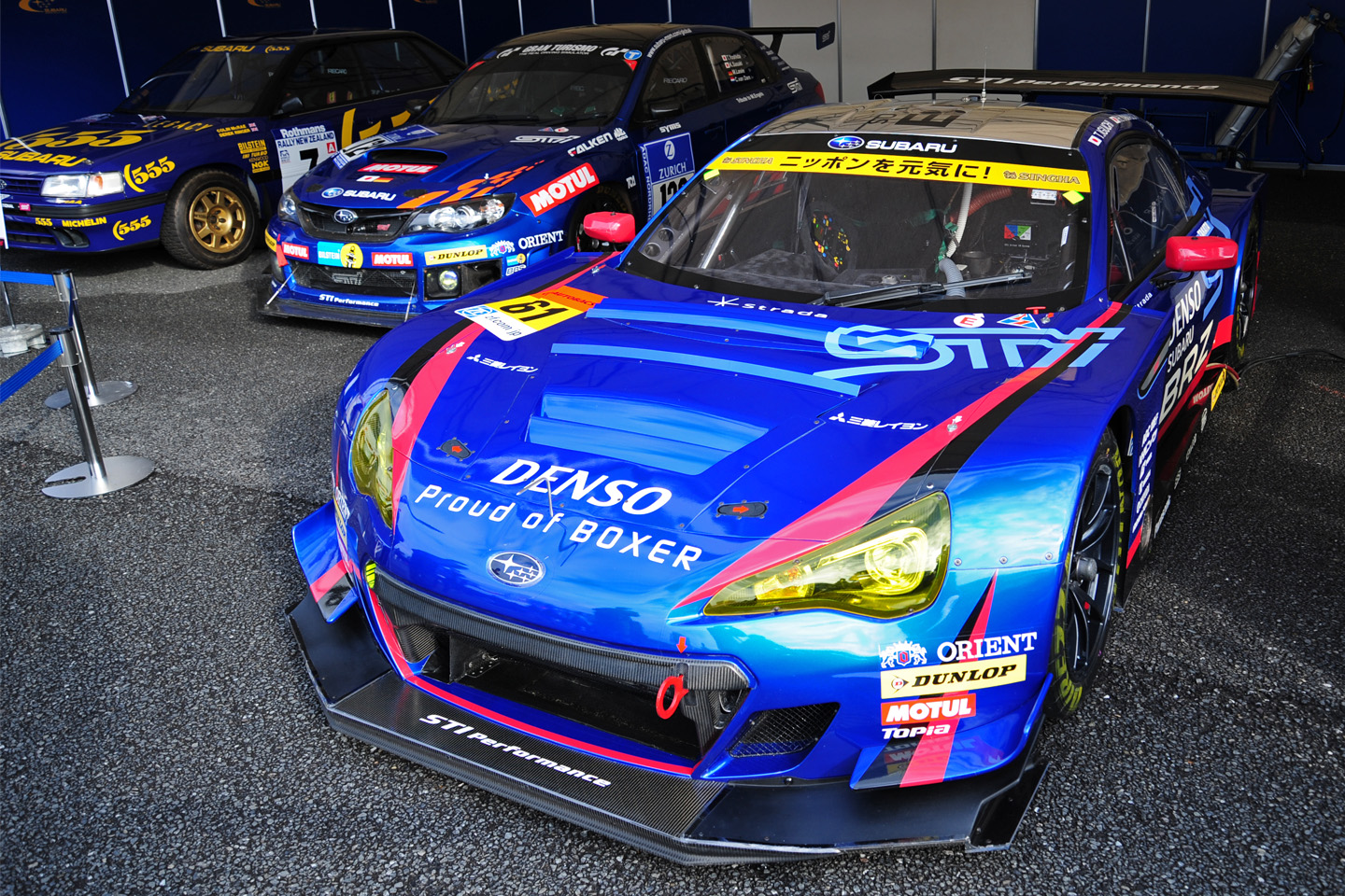 スバルブースには、今シーズンのSUPER GT、GT300クラスに参戦中の「BRZ GT300」と、’13年のニュルブルクリンク24時間耐久レースに参戦した「WRX STI」など、多彩なレーシングカーを展示。